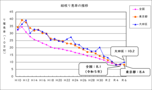 大田区の結核罹患率は減少傾向でしたが、令和6年には、10.2と増加に転じています。