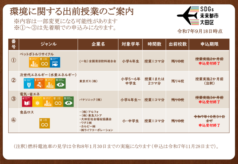 民間企業と連携した魅力的な事業(コンテンツ)です。理科・社会・家庭科などの授業の中で、また総合的な学習の時間における環境問題やSDGsの学習にぜひご活用ください。