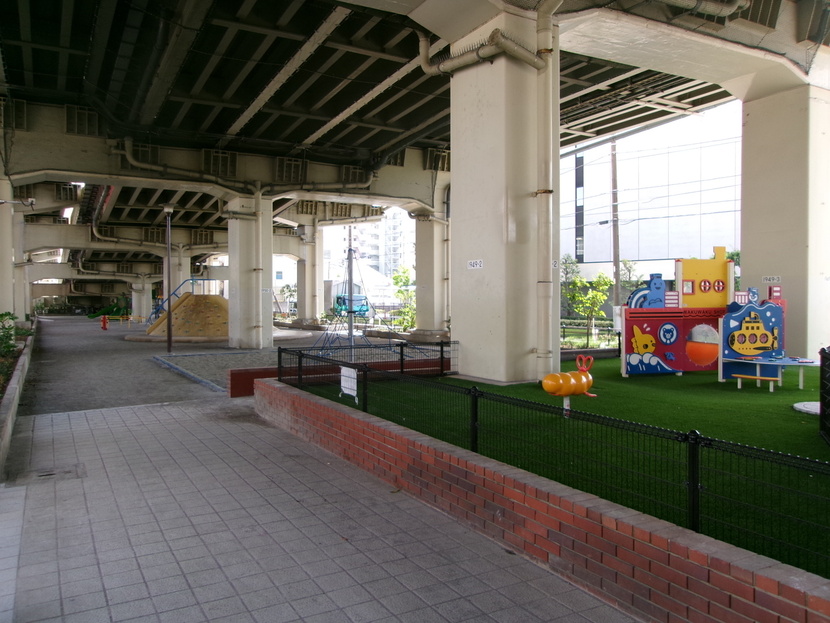 六間堀緑地は環状八号線を挟んで北側と南側のエリアに分かれており、首都高速の高架下に整備されていることから 雨の日でも濡れずに利用することができます。