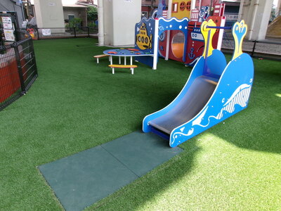 人工芝が敷かれた乳幼児用遊具のある広場です。乳幼児優先でご利用をお願いします。